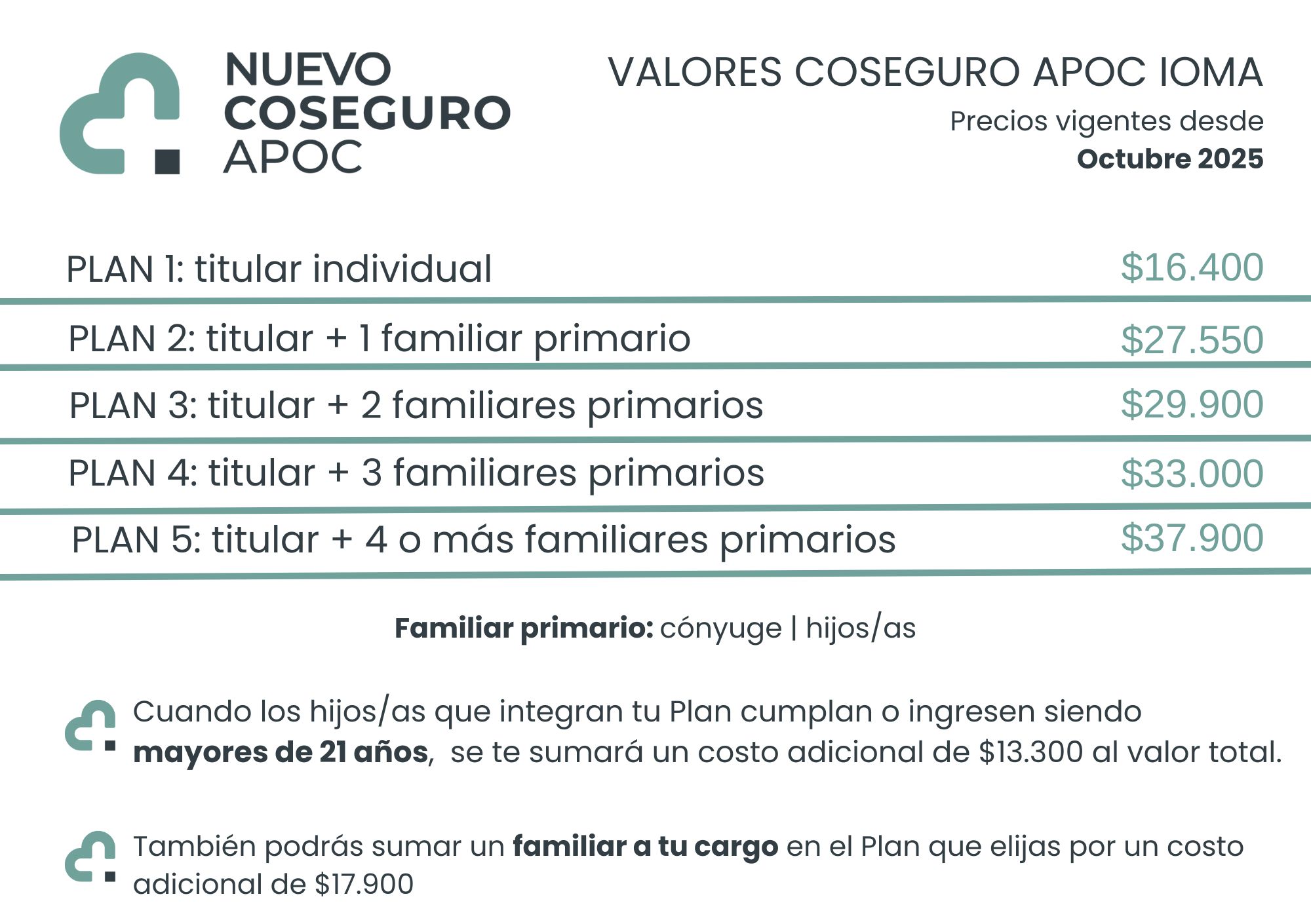 El Coseguro de APOC es un servicio superior por una cuota mensual accesible para nuestros/as afiliados/as y grupo familiar de La Plata y del Interior de la provincia, sin carencia para el ingreso y con el que podrás complementar perfectamente tu obra social IOMA.